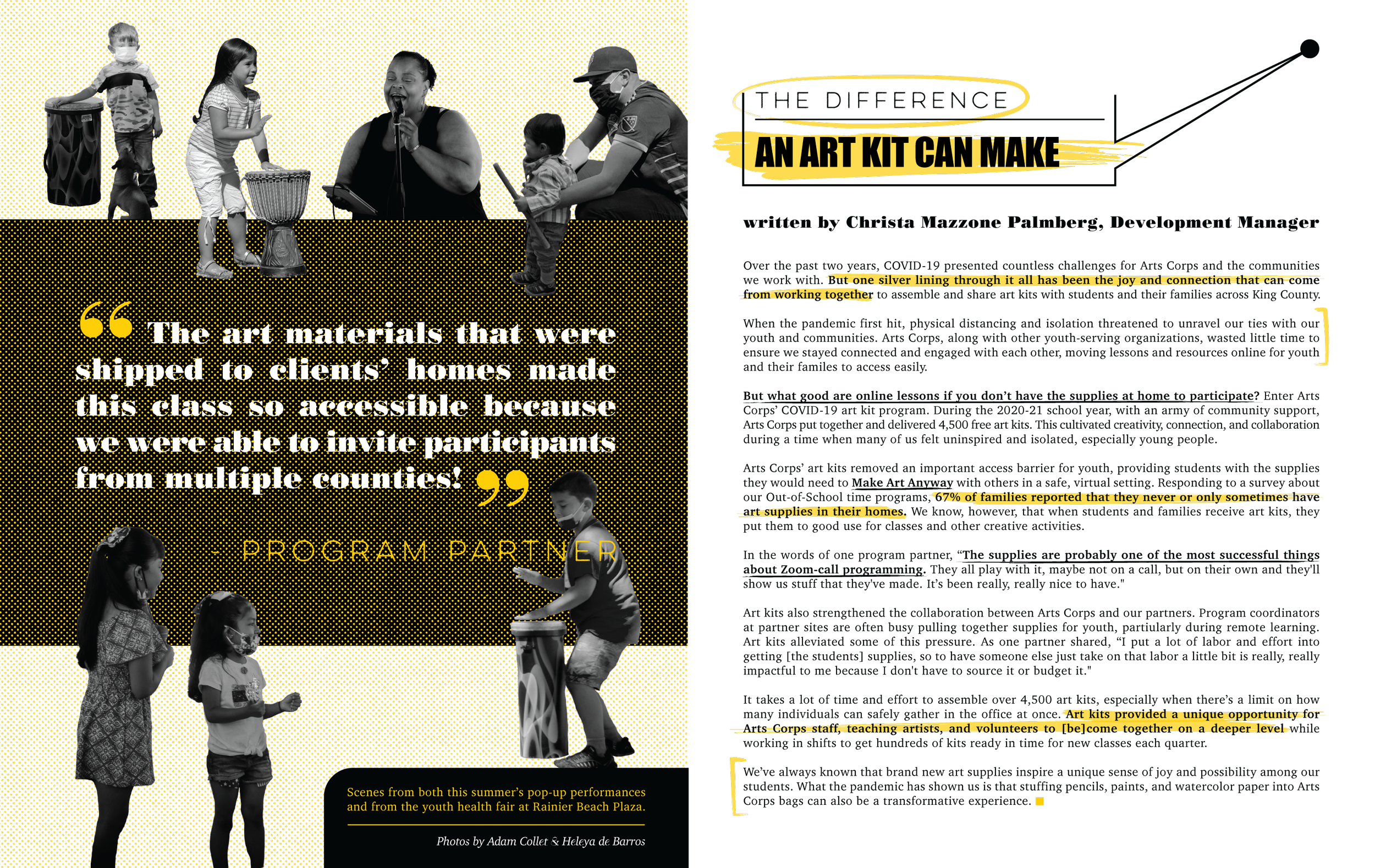 Arts Corps is a nationally recognized youth organization that works to address the race and income-based opportunity gap in access to arts education.